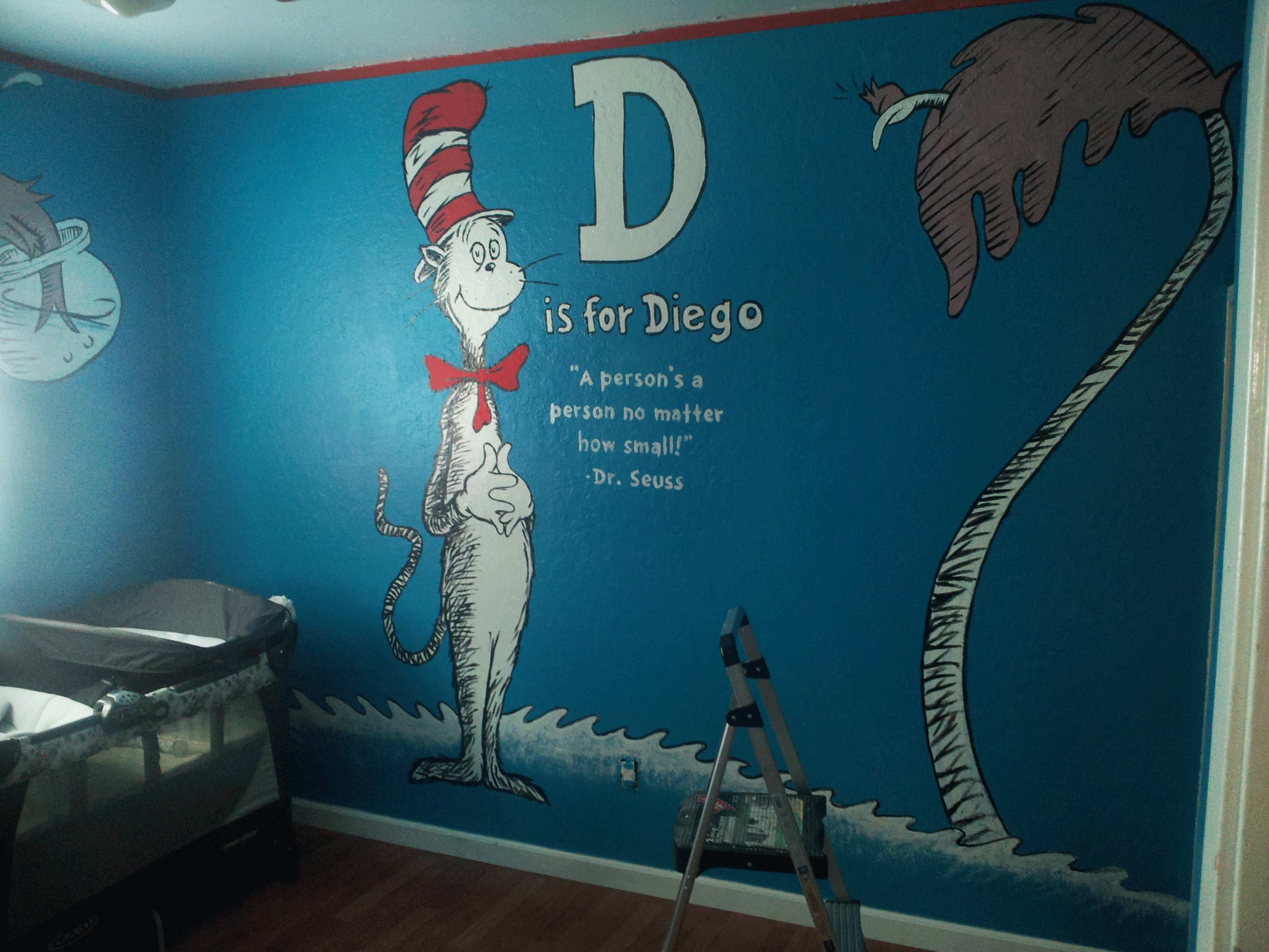 I painted this playful mural for a child’s bedroom, featuring a vibrant Dr. Seuss character standing proudly beside the phrase: “D is for Diego. A person's a person, no matter how small.” It was a joy to bring imagination, color, and a personal touch to a space meant for creativity and comfort.