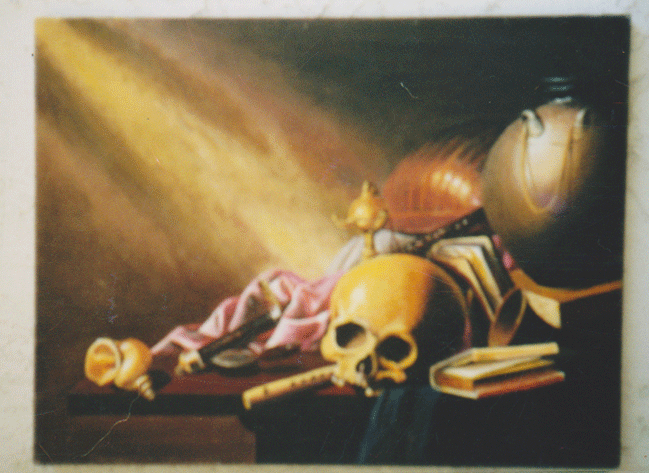 I recreated this vanitas still life mural as a tribute to the timeless themes of mortality and legacy. Every detail—from the glint of the armor to the somber skull—was hand-painted with care. My version brings a bold, modern energy to this centuries-old composition while honoring its reflective message.